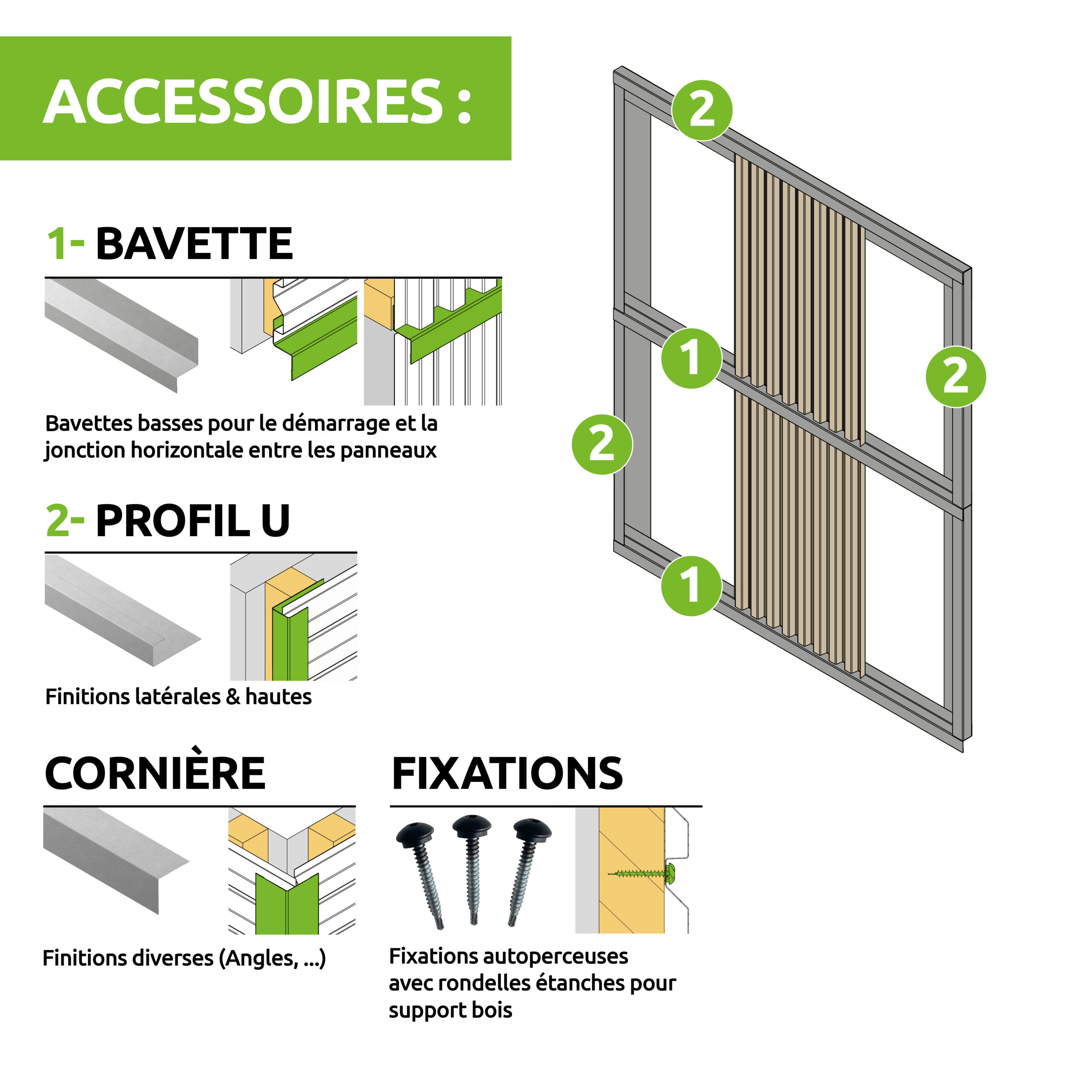 Plus qu’un matériau, ce bardage est un système constructif complet. Grâce à sa conception ingénieuse et sa gamme d’accessoires (finitions, jonctions, kits de fixation bois), il garantit une pose simple et un résultat impeccable, sans expertise technique requise.