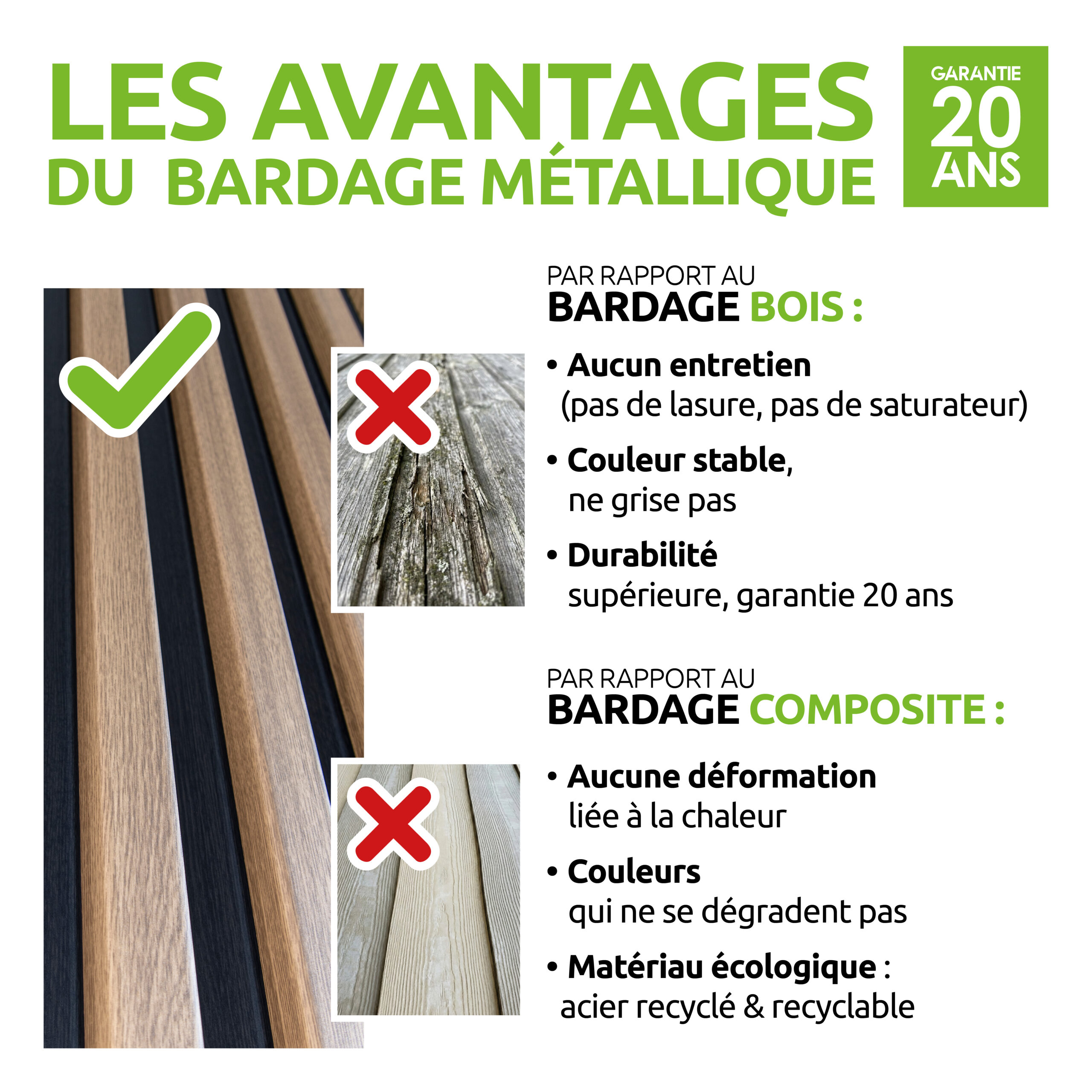 Chaque panneau capture l’authenticité du bois grâce à une finition haut de gamme imitant à la perfection ses nuances et textures. Son matériau métallique de qualité lui confère une grande résistance aux agressions climatiques, assurant ainsi une tenue impeccable dans le temps sans altération de la couleur ou de la structure.